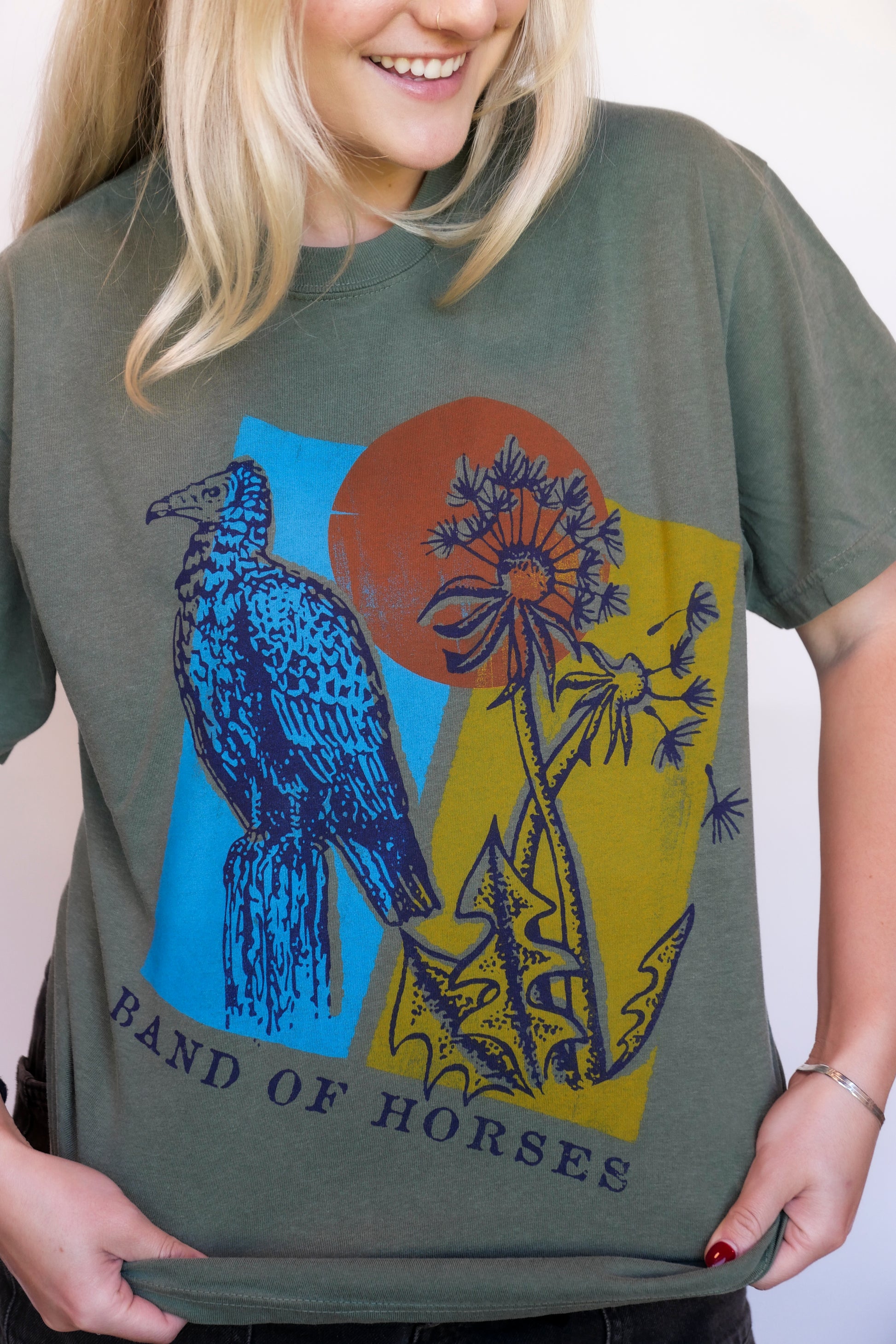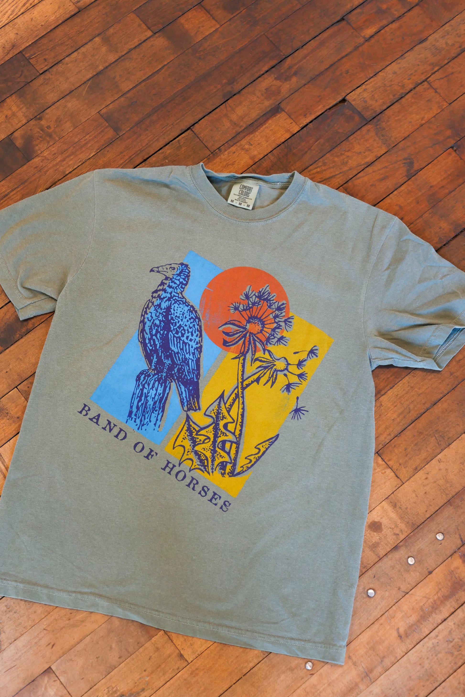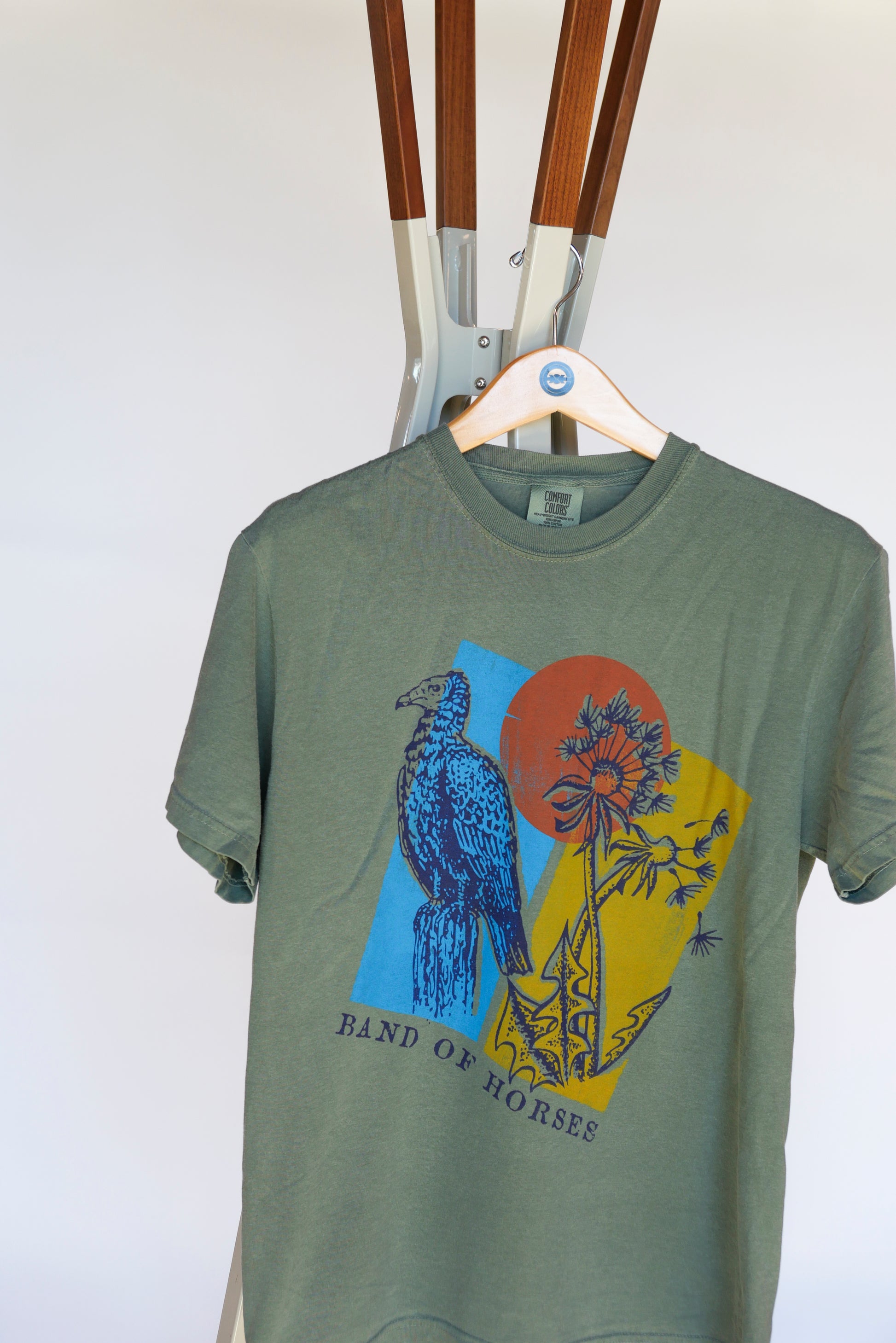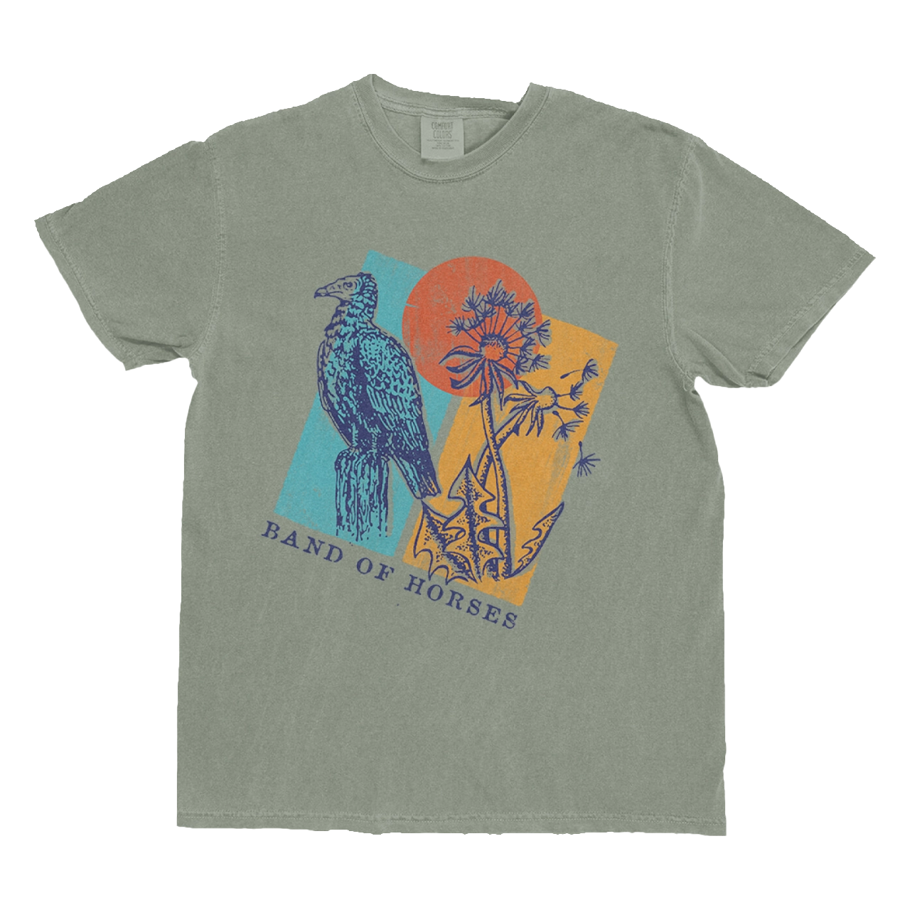 Dusty green like the foothills at dawn and soft as a memory you can’t quite place, the Dandelion Tee feels like a long drive with the windows down and nothing on the radio but your thoughts. Featuring a blue vulture, sun-washed wildflowers, and a burst of golden hour geometry, this tee lives somewhere between desert daydream and dive bar poetry.