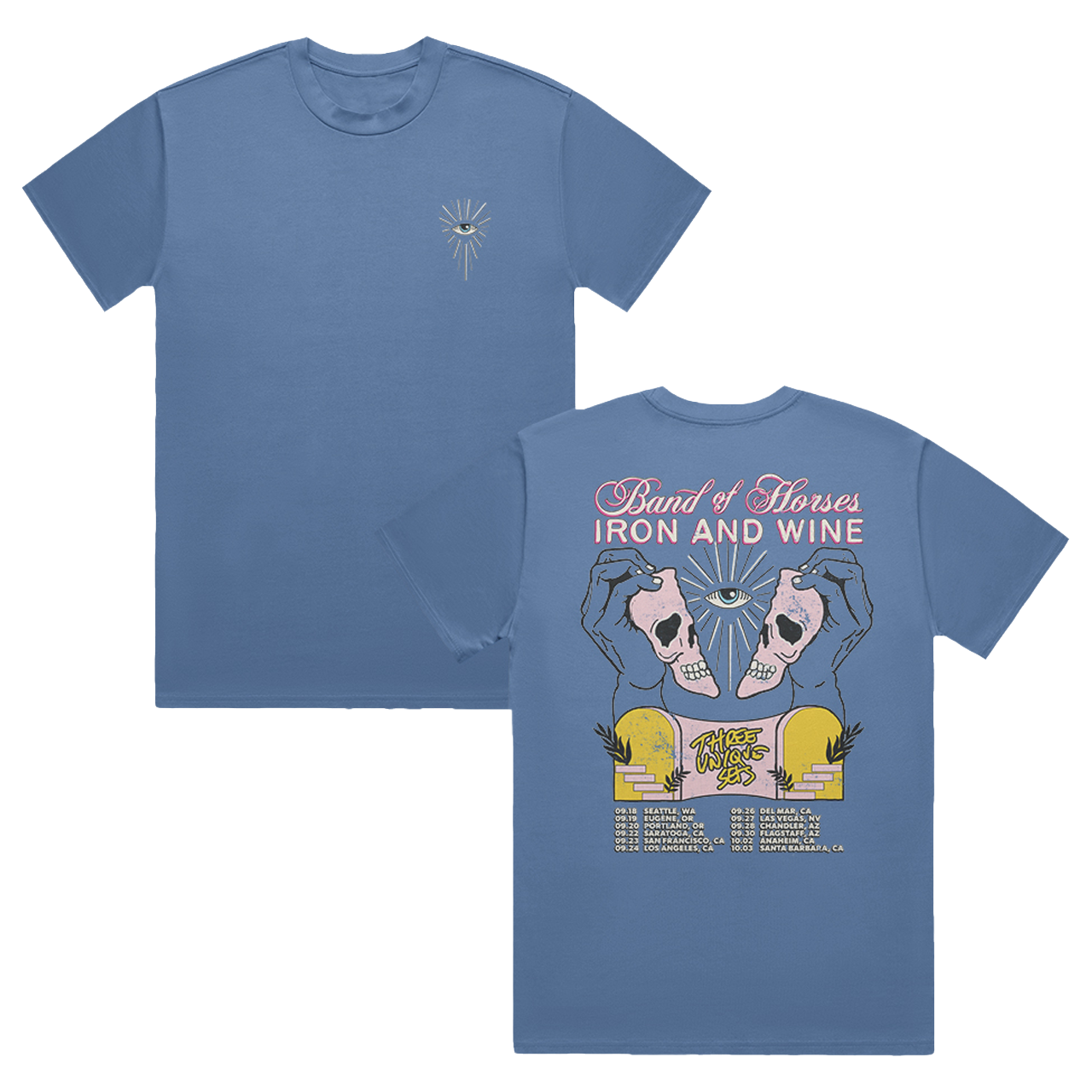 A shirt that holds the echoes of every note played and every mile traveled. This soft blue tee marks the 2025 Band of Horses + Iron & Wine run, with a subtle chest emblem up front and a striking back print — hands lifting twin skulls beneath an all-seeing eye, framed by warm desert tones and the tour’s city stops. Built from comfy cotton that feels like it’s already been through a few shows with you, it’s the perfect companion for road trips, late-night playlists, and the moments that stick with you long after the encore.