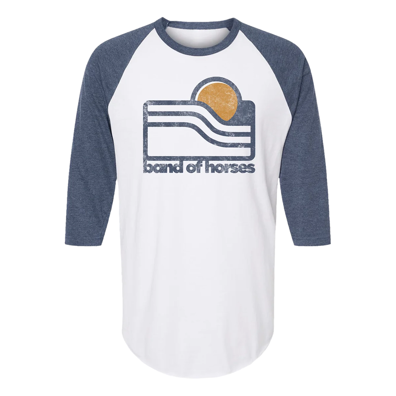 Minimal design printed on a white and navy unisex 50/50 cotton/poly blend raglan.