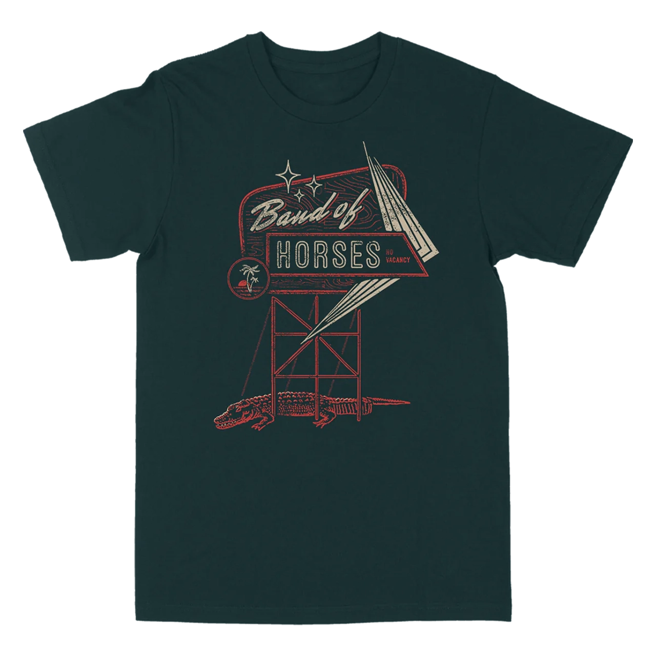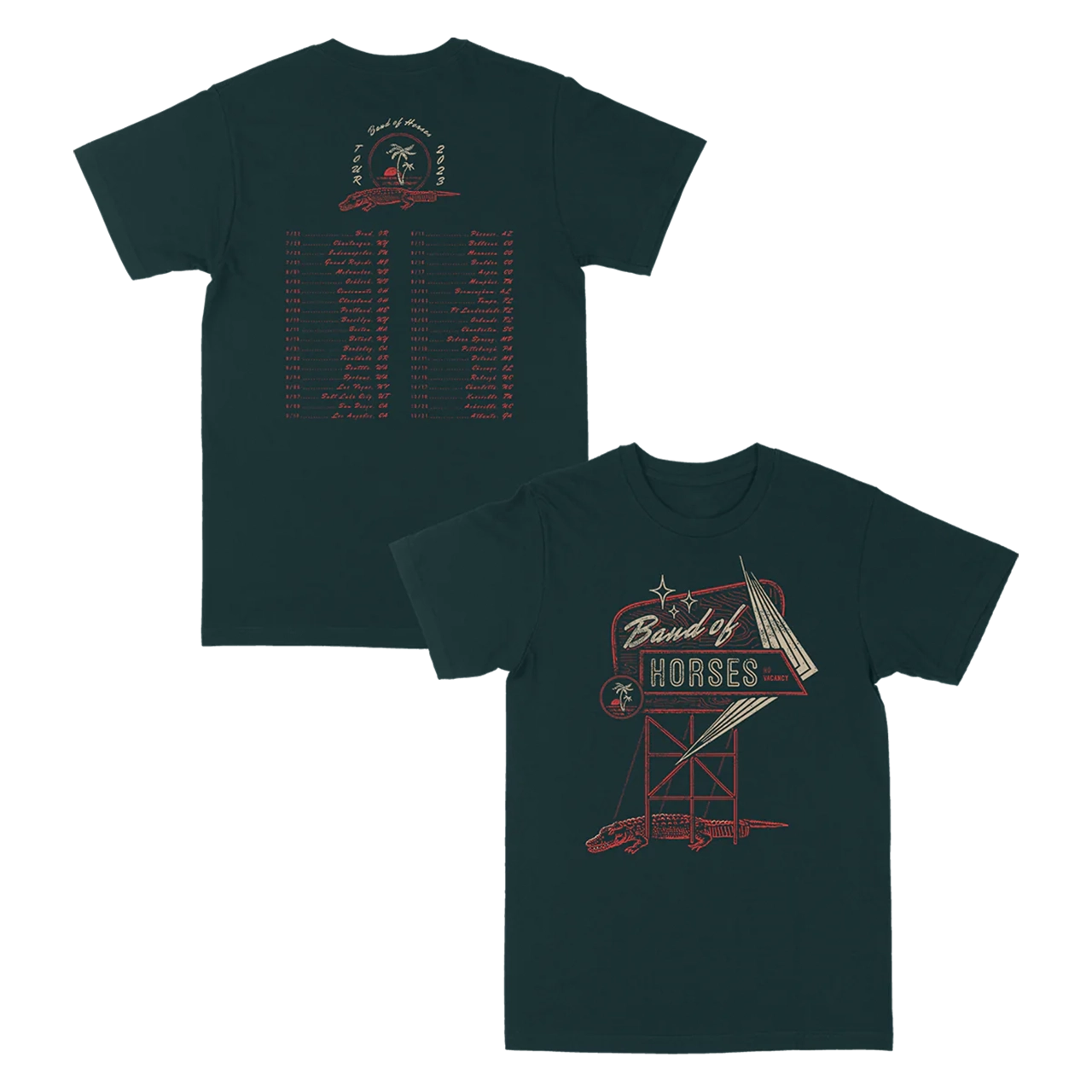 Motel Sign design printed on the front with 2023 tour dates printed on the back of a black 100% cotton unisex t-shirt.