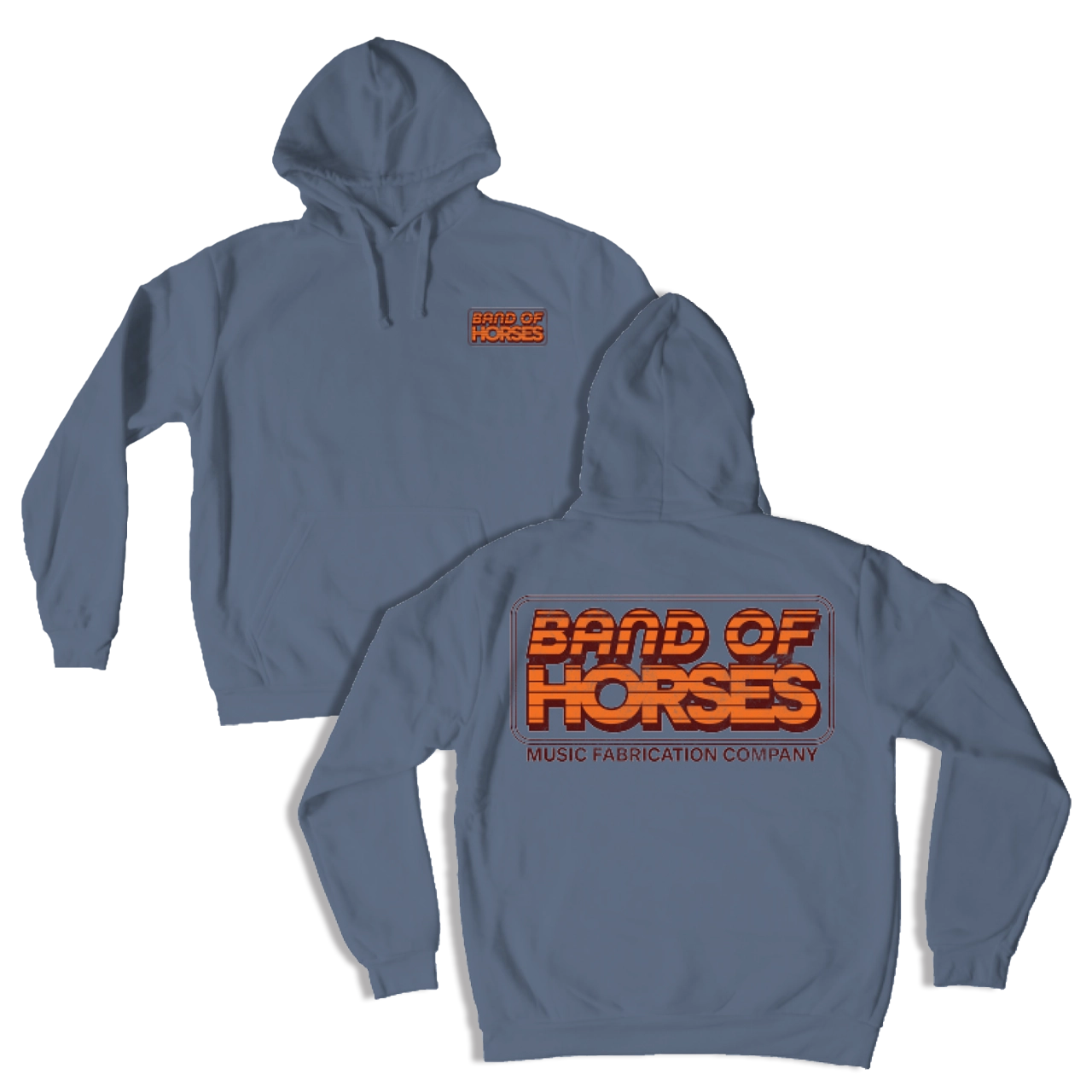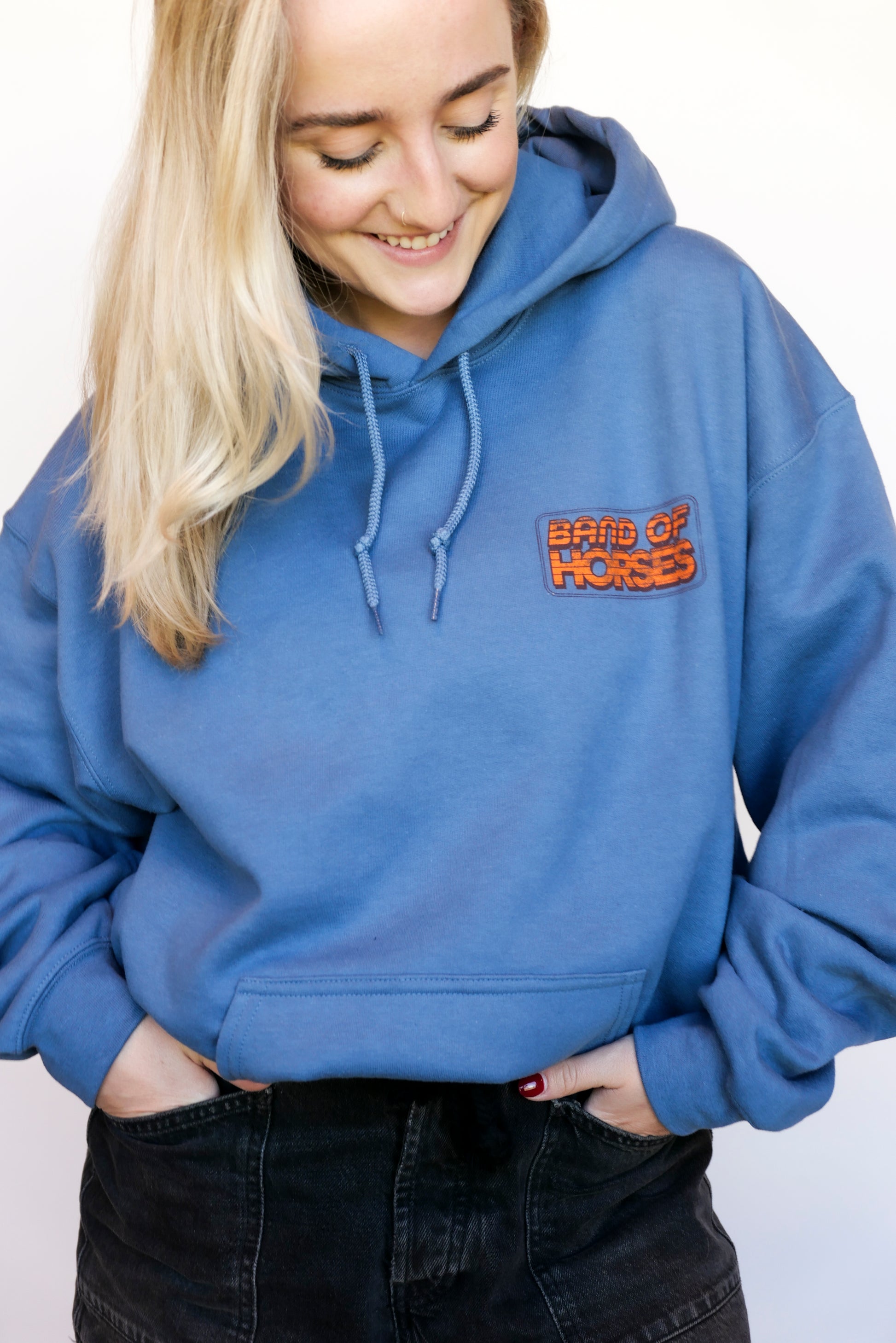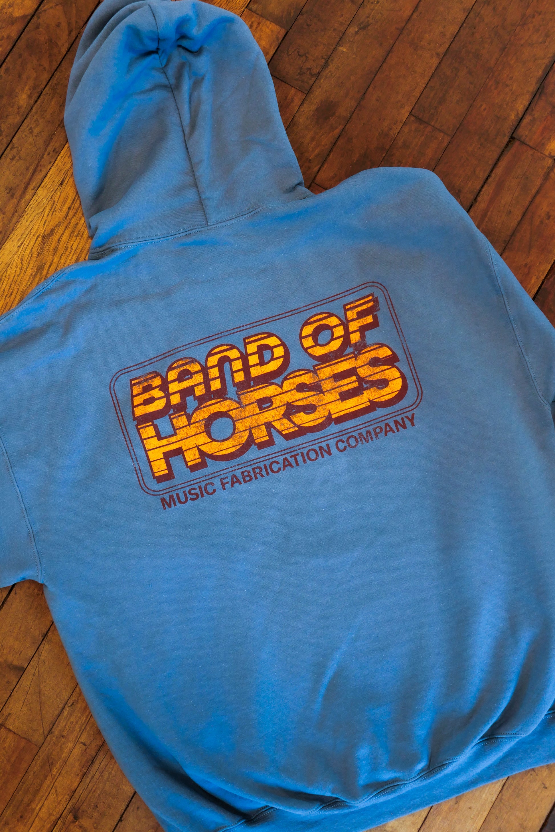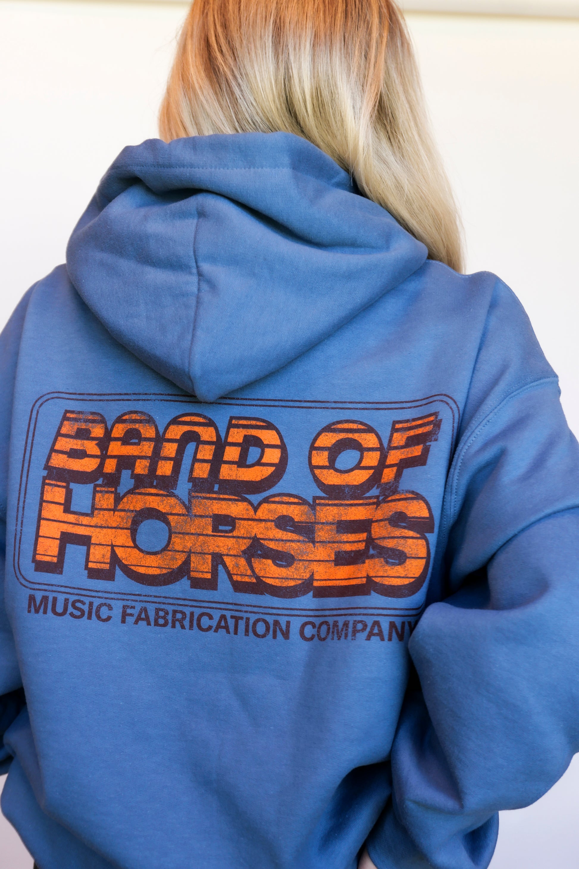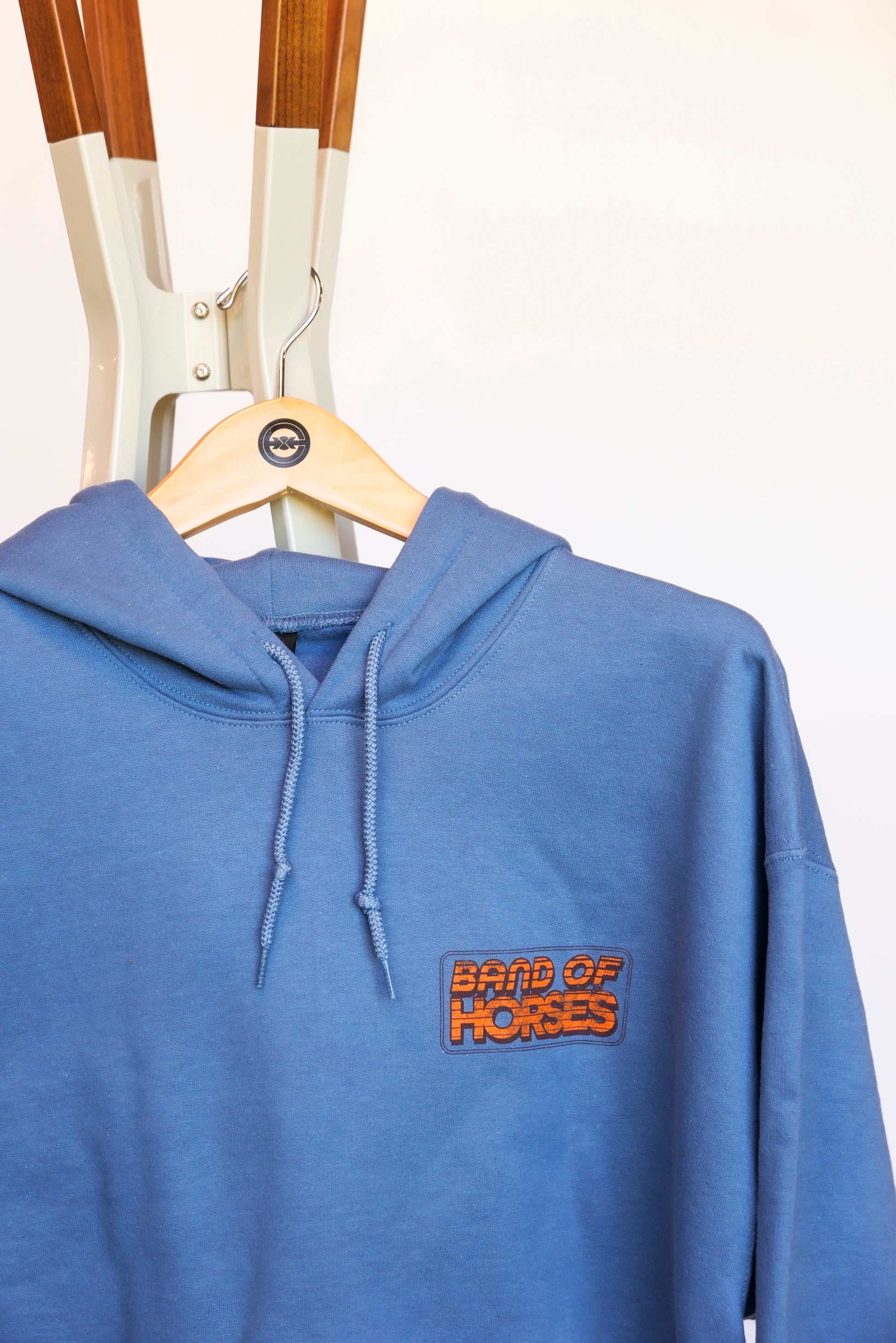 Stay warm with this blue Band of Horses' Stamp Hoodie featuring an orange logo on the front left chest and the back.
